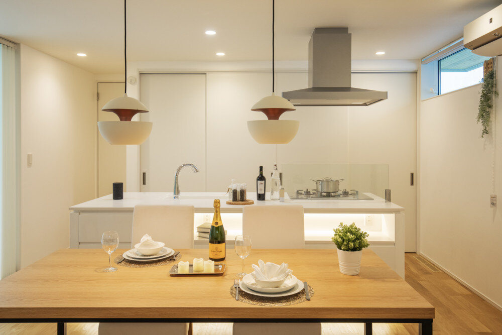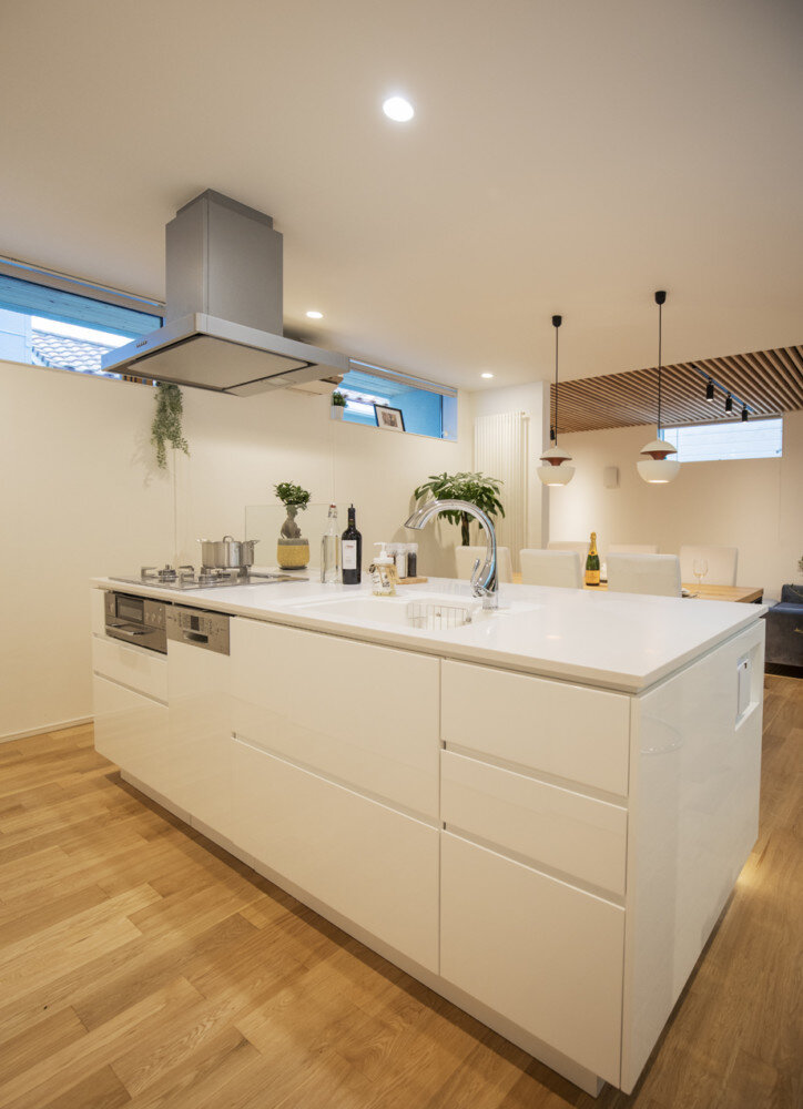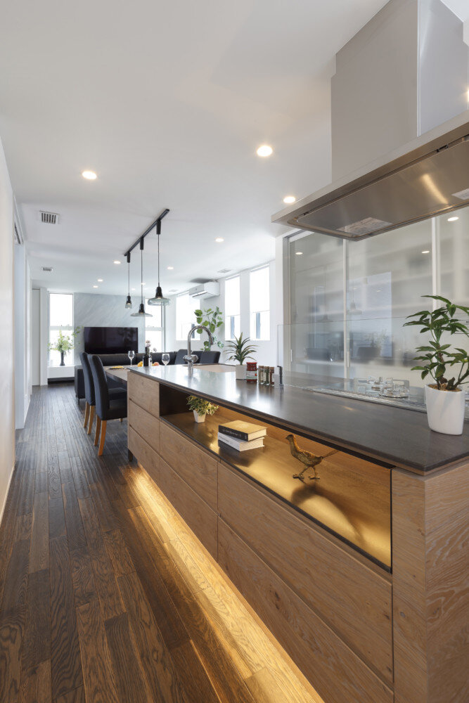 LDK空間のアクセントとなるような存在感を放つキッチンですが、デザイン性だけでなく、大容量の背面収納と広いワークトップで機能面でも優れた逸品。