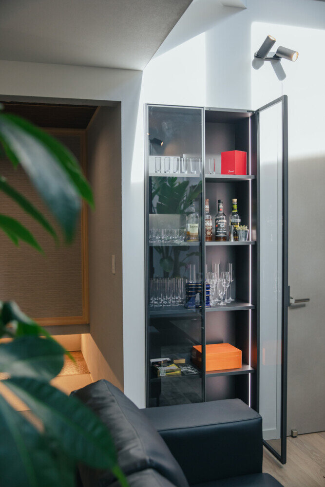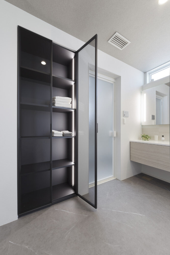 このガラス扉の魅せる収納は、海外ホテルのような非日常を味わえるサニタリー空間を演出します。